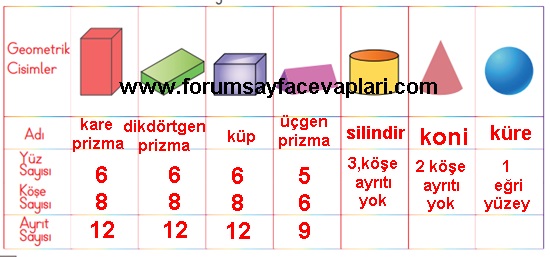 - Küp, kare prizma, dikdörtgen prizma, üçgen prizma, silindir, koni ve küre birer geometrik cisimdir.