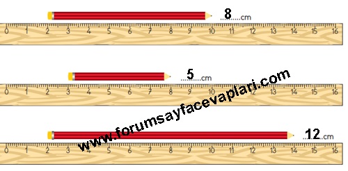 1 Aşağıdaki ölçümlerde her ölçümün sıfırdan başlamadığına dikkat edelim. Başlangıç ve bitiş noktaları arasındaki aralıkları sayalım. Kalemlerin boyunun kaç cm olduğunu, örnekteki gibi yazalım.