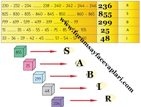 8- Aşağıdaki örüntülerde boş bırakılan yerlere gelmesi gereken sayıları bulunuz. Sayılara karşılık gelen harfleri yerleştirerek şifreyi oluşturunuz.