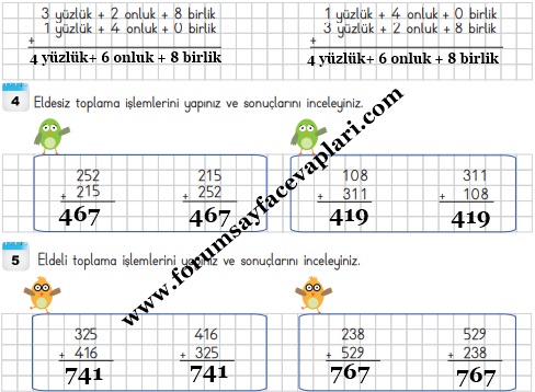 3 – Aşağıda çözümlenmiş halde verilen eldesiz toplamaları yapınız.