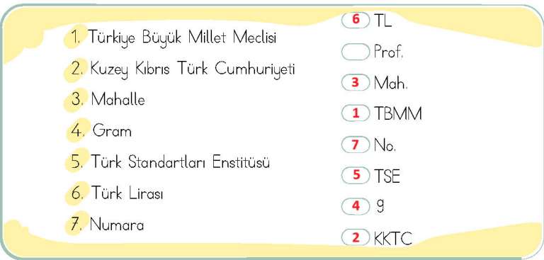 Verilen kelimeleri kısaltmalarıyla eşleştiriniz.