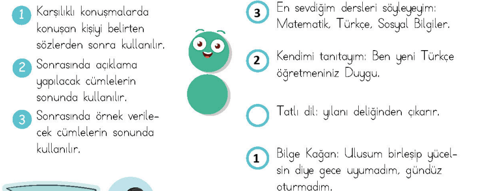 İki noktanın kullanım alanlarını okuyunuz. Verilen örneklerle kullanım alanlarını eşleştiriniz.